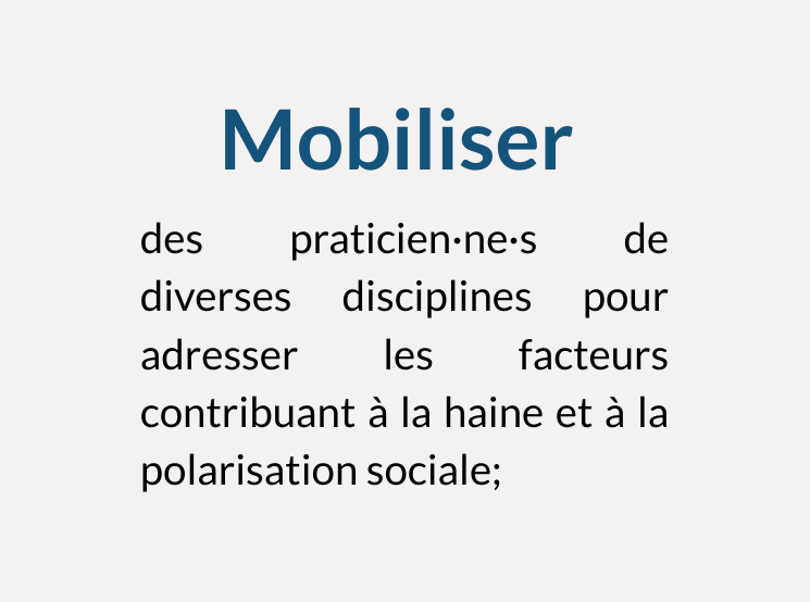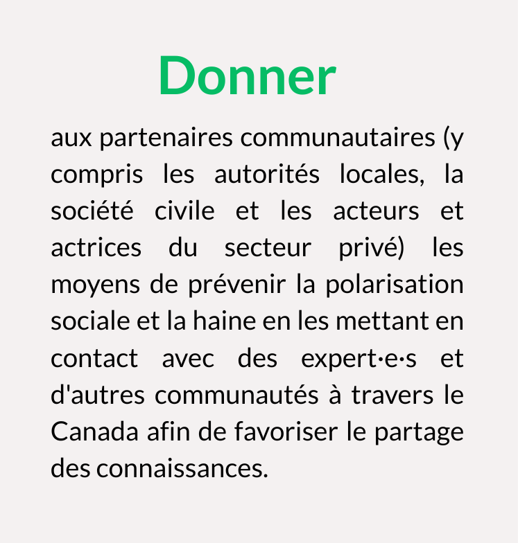 Renforcer la prévention en soutenant la préparation, l’engagement et la collaboration multisectorielle est un projet de deux ans, financé par Sécurité publique Canada par l’intermédiaire du Fonds de résilience communautaire (FRC) du Centre canadien pour l’engagement communautaire et la prévention de la violence. Le projet vise à piloter et à développer des partenariats multisectoriels locaux à travers le Canada afin d’aborder les questions de polarisation sociale et de haine pouvant mener à la violence.