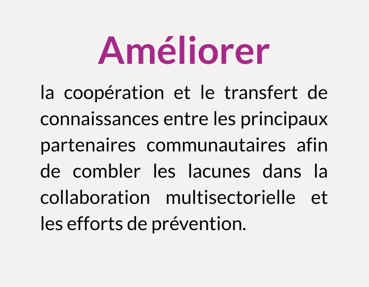 Le projet vise à amplifier les voix des communautés dans la formulation de réponses adaptées aux contextes locaux. Les communautés participantes joueront un rôle clef dans l’articulation des priorités, l’élaboration de stratégies de prévention et le co-développement de réponses ancrées dans leurs contextes, leurs réalités vécues ainsi que leurs forces respectives. Pour ce faire, nous travaillerons avec les communautés de manière participative et mettrons l’accent sur l’importance de la relation, de la collaboration et des perspectives locales.